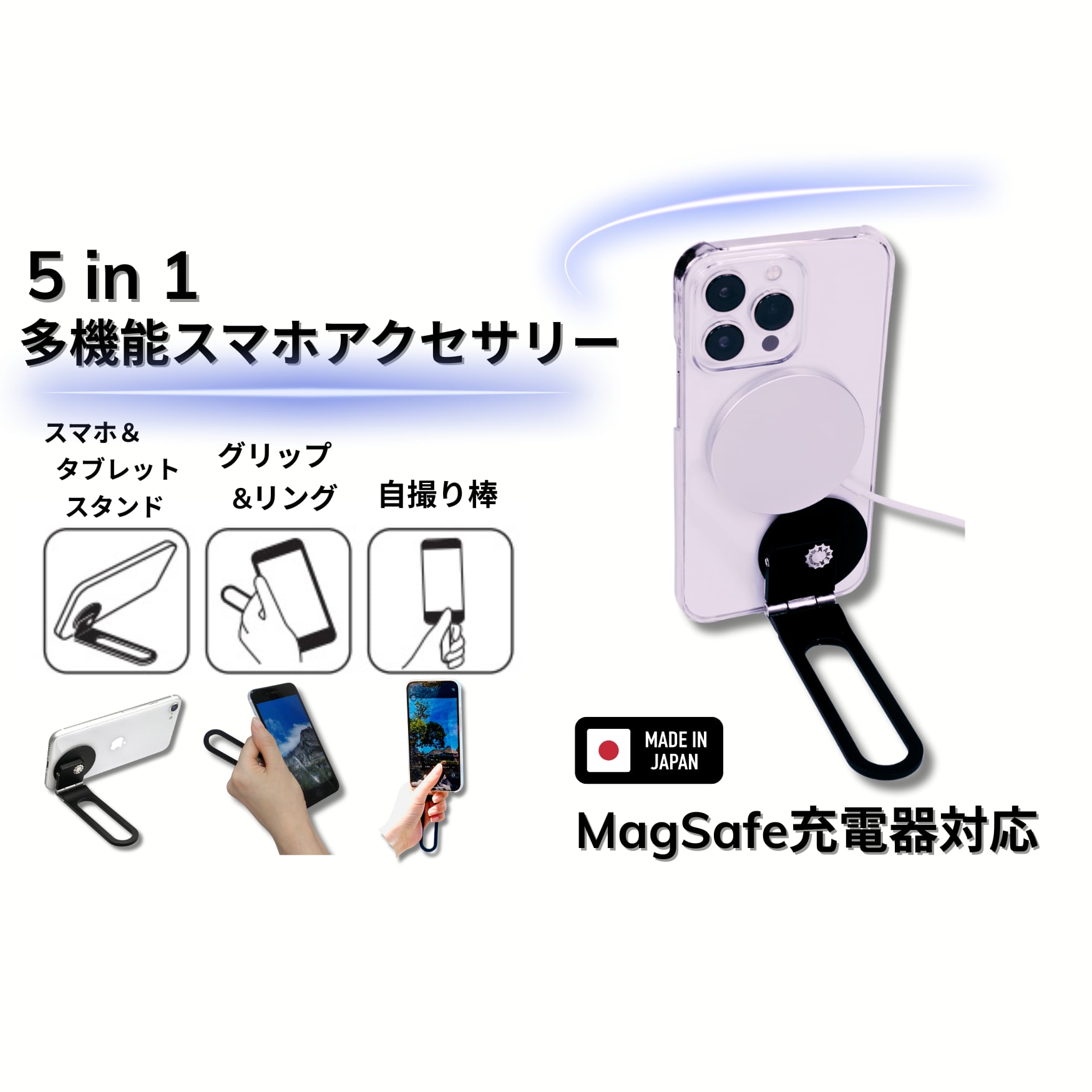 MagSafe充電器対応・5in1多機能設計で、スマホスタンド・タブレットスタンド・グリップ・リング・自撮り棒の5つの機能を1台に集約。