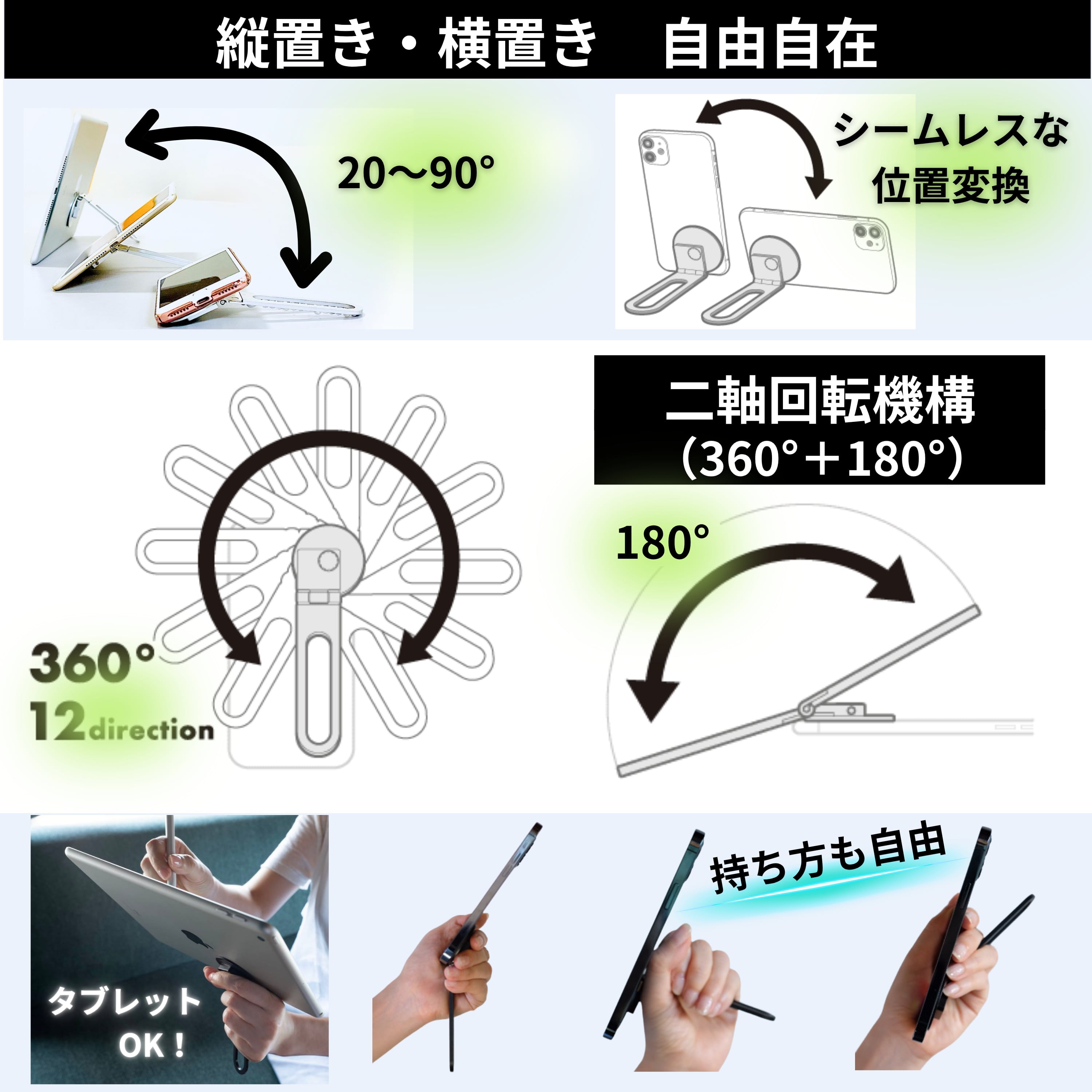 二軸回転(360°+180°)で縦置き・横置き・角度調整も自在。